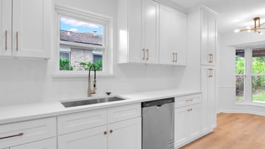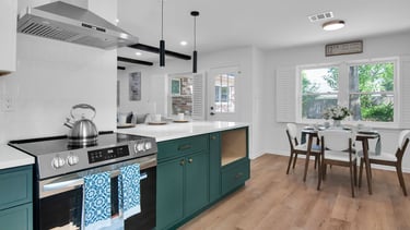 La cocina, protagonista del hogar, cuenta con gabinetes elegantes, electrodomésticos actualizados y una amplia barra tipo península que se integra con el comedor y la sala, creando un ambiente perfecto para compartir con familia o invitados.